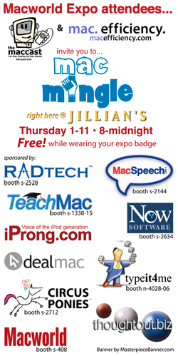 In 2004 I created a Macworld Expo party of my own invention — a party where all Macworld Expo attendees were welcome and you didn't need to waste critical expo time hunting down a secret invitation or pay to attend. From 2004-2007 I called it the Party For The People. In 2007 I joined forces with Adam Chrisitanson and we called our new party MacMingle.